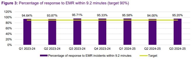 FRV has consistently exceeded its 90% target for responding to EMR incidents within 9.2 minutes each quarter. FRV recorded a result of 95.2% this quarter, which is 5.2% higher than its target (Figure 3).