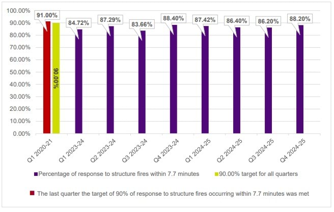 FRV’s result for this measure in Q4 in 2024–25 represents the 19th consecutive quarter where the target of 90% has not been met. Q1 of 2020–21 was the last quarter when this target was achieved (indicated in red in Figure 6). The Q4 result of 88.2% was a 2.5% increase on the Q3 result of 86.2%.