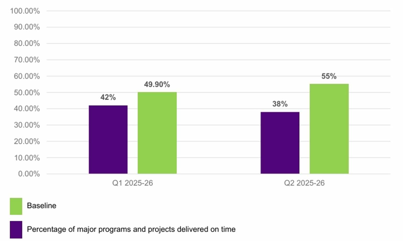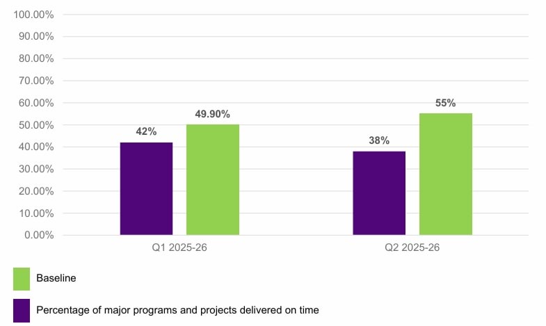 CFA reported 38% of major programs and projects as having an overall status of ‘on track’ at the end of Q2 against a 3-year baseline of 55%. This is the second reporting period in which the results were below the baseline. CFA have advised inconsistencies in project delivery practices, controls and monitoring across portfolios contributed to the result.