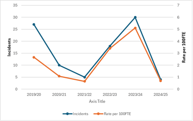 Reported incidents decreased by 86.5 per cent per 100 FTE staff in 2024–25, with four incidents reported. This is demonstrated in the chart below. This represents 26 fewer incidents compared with the previous year. The four incidents reported included injuries, ‘near misses’ and detected workplace hazards.
