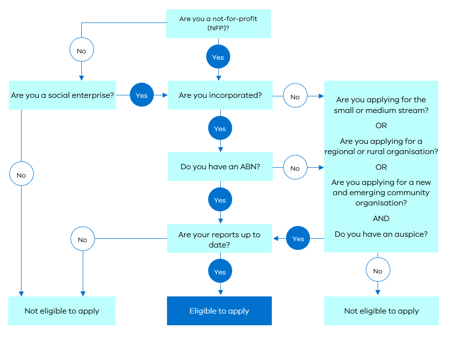 Unincorporated associations and community organisations with no ABN are not eligible but can apply using an auspice. See ‘Auspiced applications’ for more information.