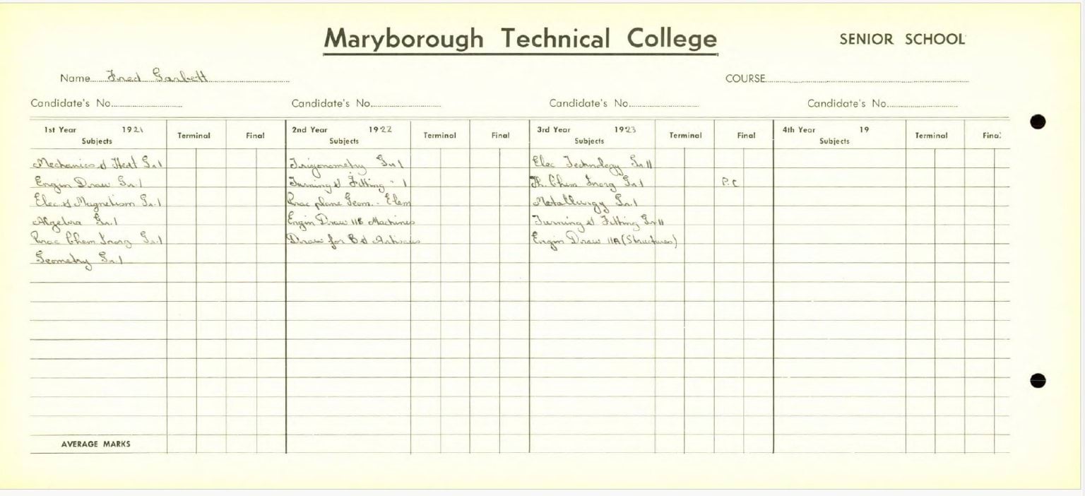 Maryborough Technical College enrolment card 1921