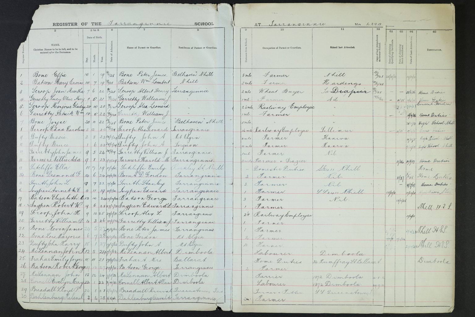 Open page of Tarranginnie School's pupil register