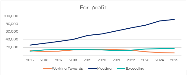 Figure A2.3 below shows this trend in quality rating for the for-profit and not-for-profit long day care services by total number of places.