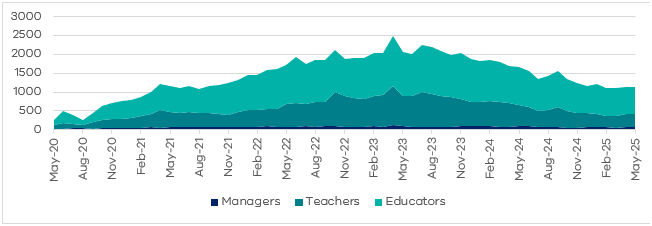Figure A2.5 below shows the annual growth in places, by provider type, noting that the 2025 data is for the first quarter only, and new standalone kindergartens are more likely to open at the start of the school year.