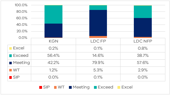 Note: ‘KGN’ is stand-alone Kindergarten; ‘LDC FP’ is long day care for-profit; ‘LDC NFP’ is long day care not-for-profit; ‘SIP’ is Significant Improvement Required; ‘WT’ is Working Towards; ‘Exceed’ is Exceeding and ‘Excel’ is Excellent.