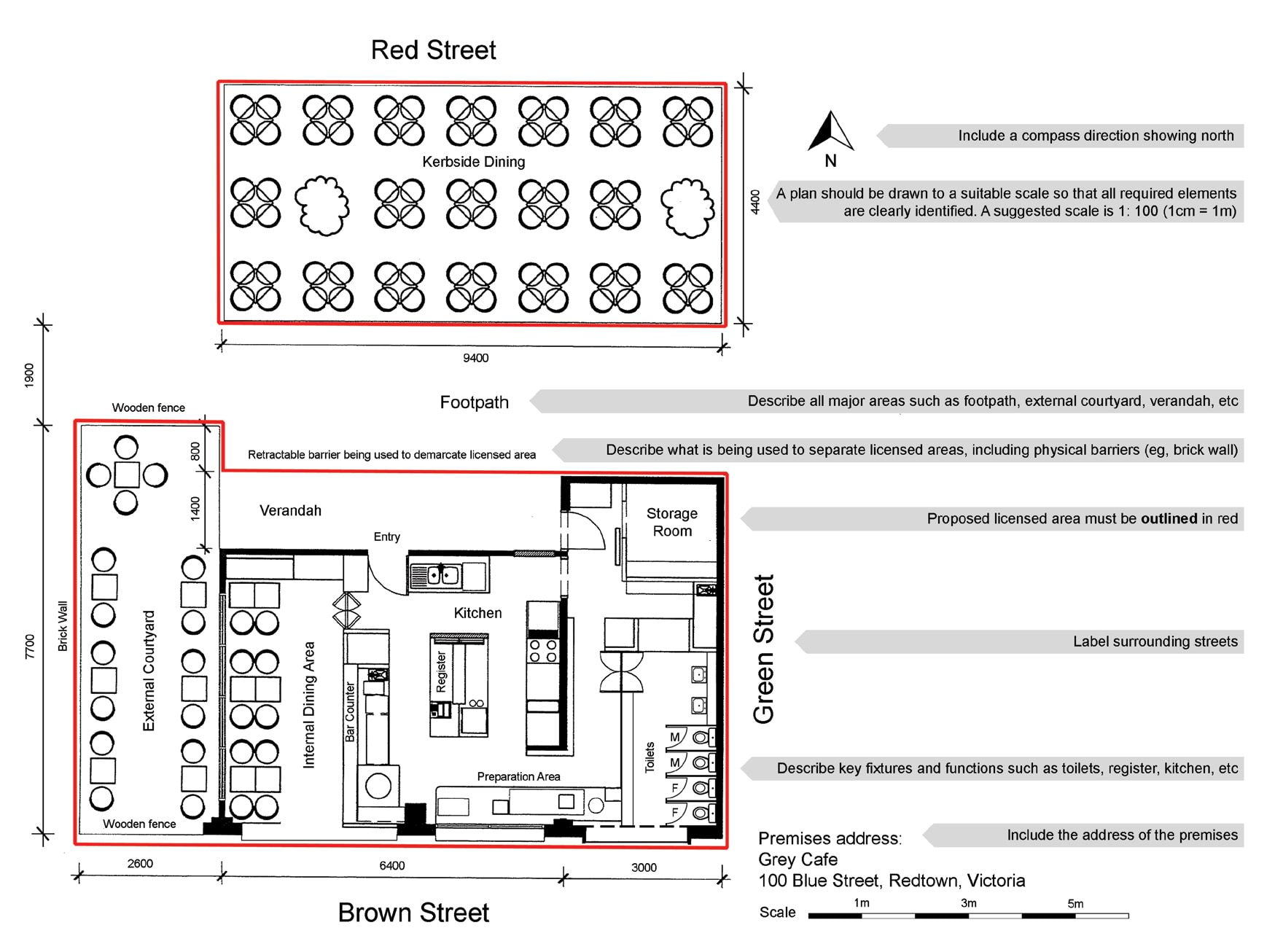 - outline the licensed area in a continuous red line – if drawing by hand, use pen or ink (not pencil or highlighter)