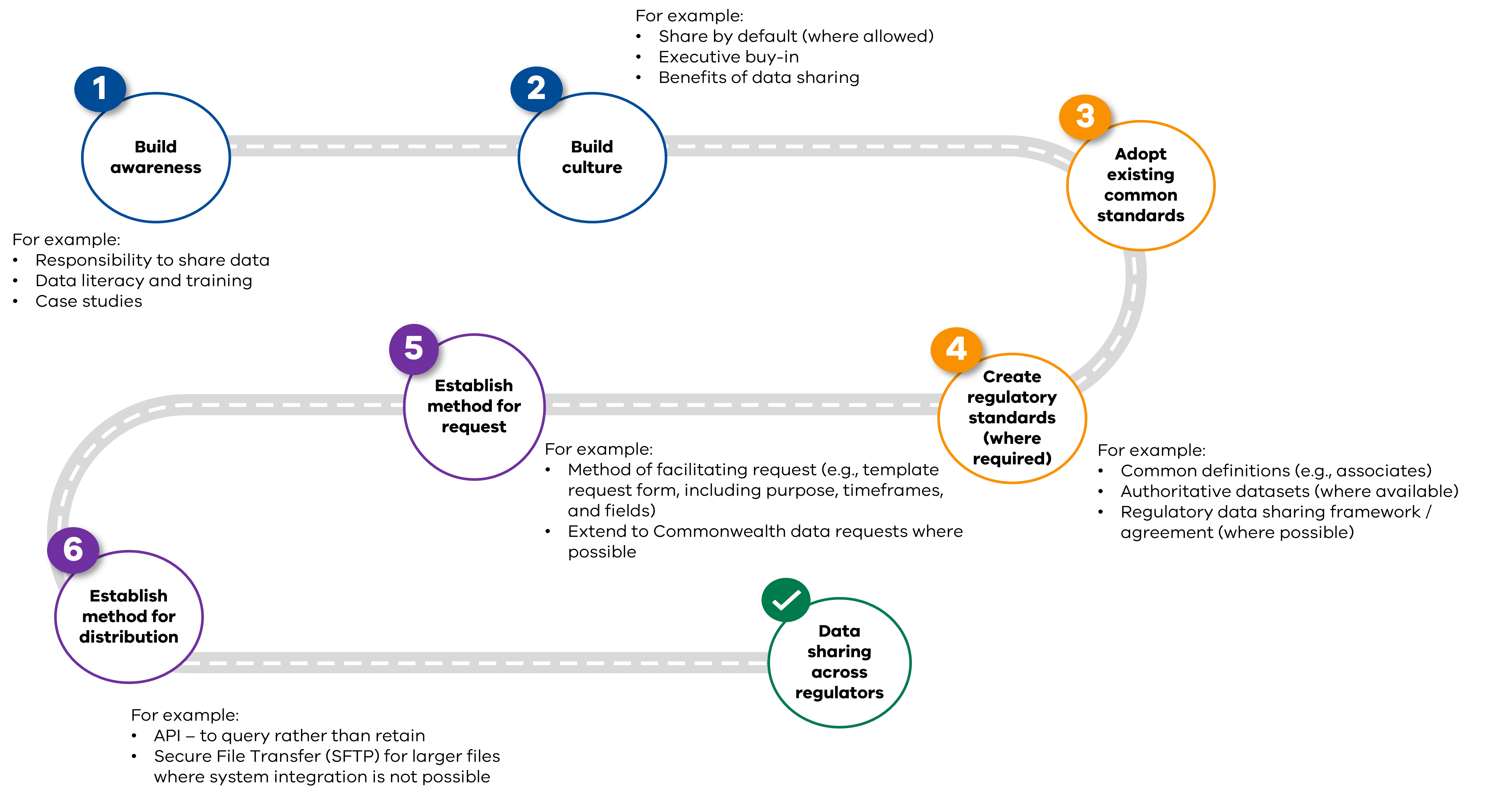 Flowchart illustrating a six-step process for enabling data sharing across regulators. Each step is numbered and includes examples: