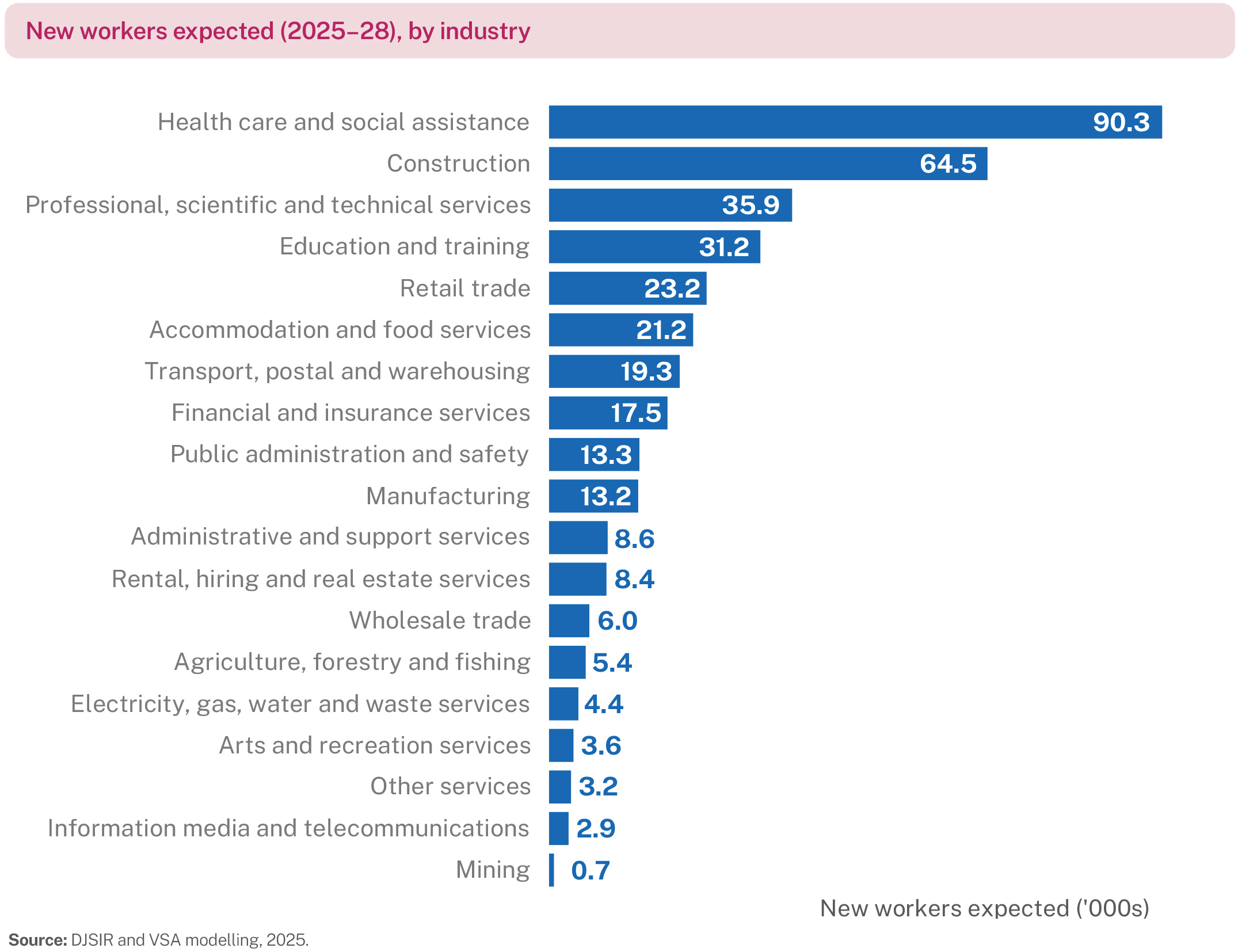 - Health care and social assistance and construction are expected to lead workforce growth. Over 40% of new workers are expected in jobs within these industries over 2025–28.