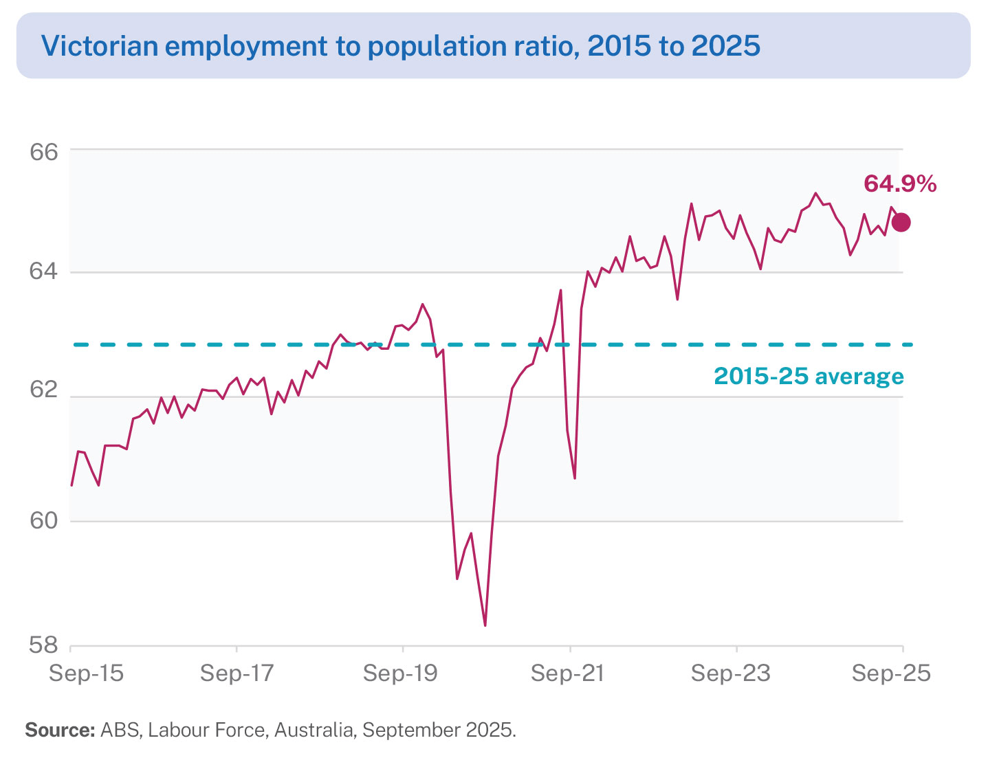 The number of Victorians in employment as a share of the population remains high at 64.9% in September 2025 – a key strength of Victoria’s labour market. More than 3.8 million Victorians are employed throughout the state.