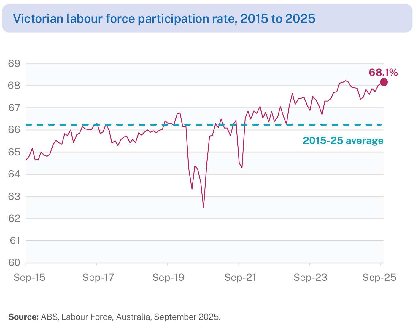 - The Victorian labour force participation rate rose to 68.1% in September 2025, almost equal to the all-time high of 68.2% in September 2024.