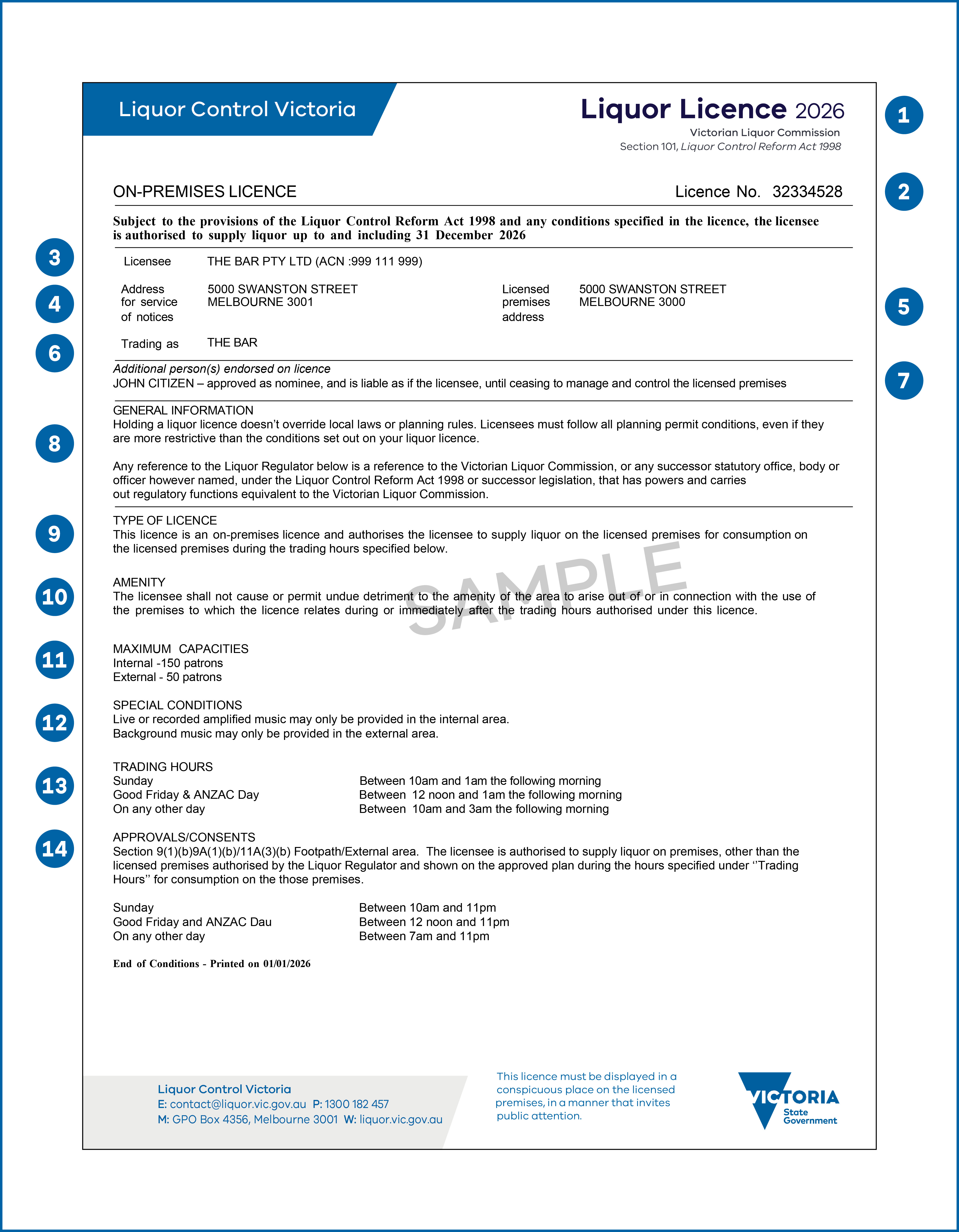 This is who holds the licence or permit and is responsible for the supply of alcohol. They can be a company, partnership, individual or incorporated association.
