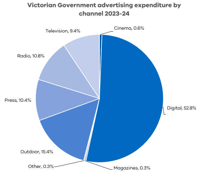Expenditure for 2023–24 showed advertising via digital and social media platforms accounted for 52.8 per cent of the government’s total spend, increasing from 46.6 per cent in 2022–23.